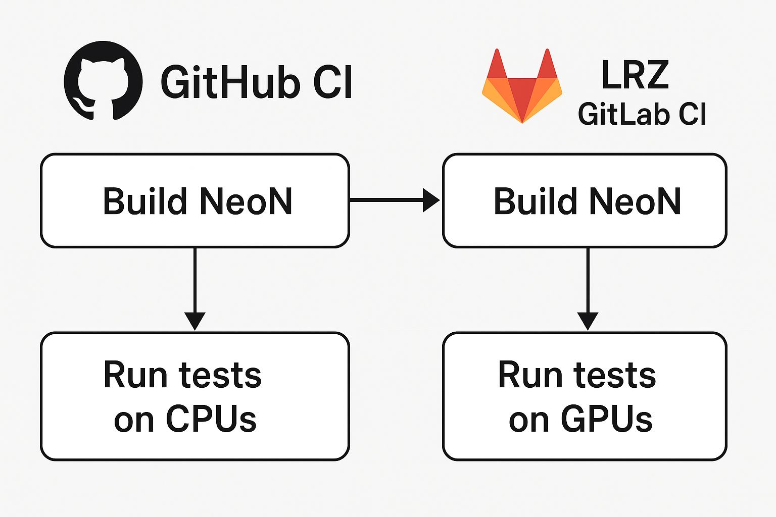 GitHub CI builds and tests NeoN on CPUs, and pushes the same branch to LRZ GitLab.